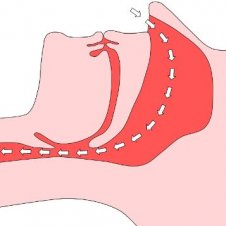 Hier sind die Atemwege im „normalen" Zustand dargestellt. Der hintere Rachen ist frei und die Atemluft (siehe weisse Pfeile) kann ungehindert durchströmen.